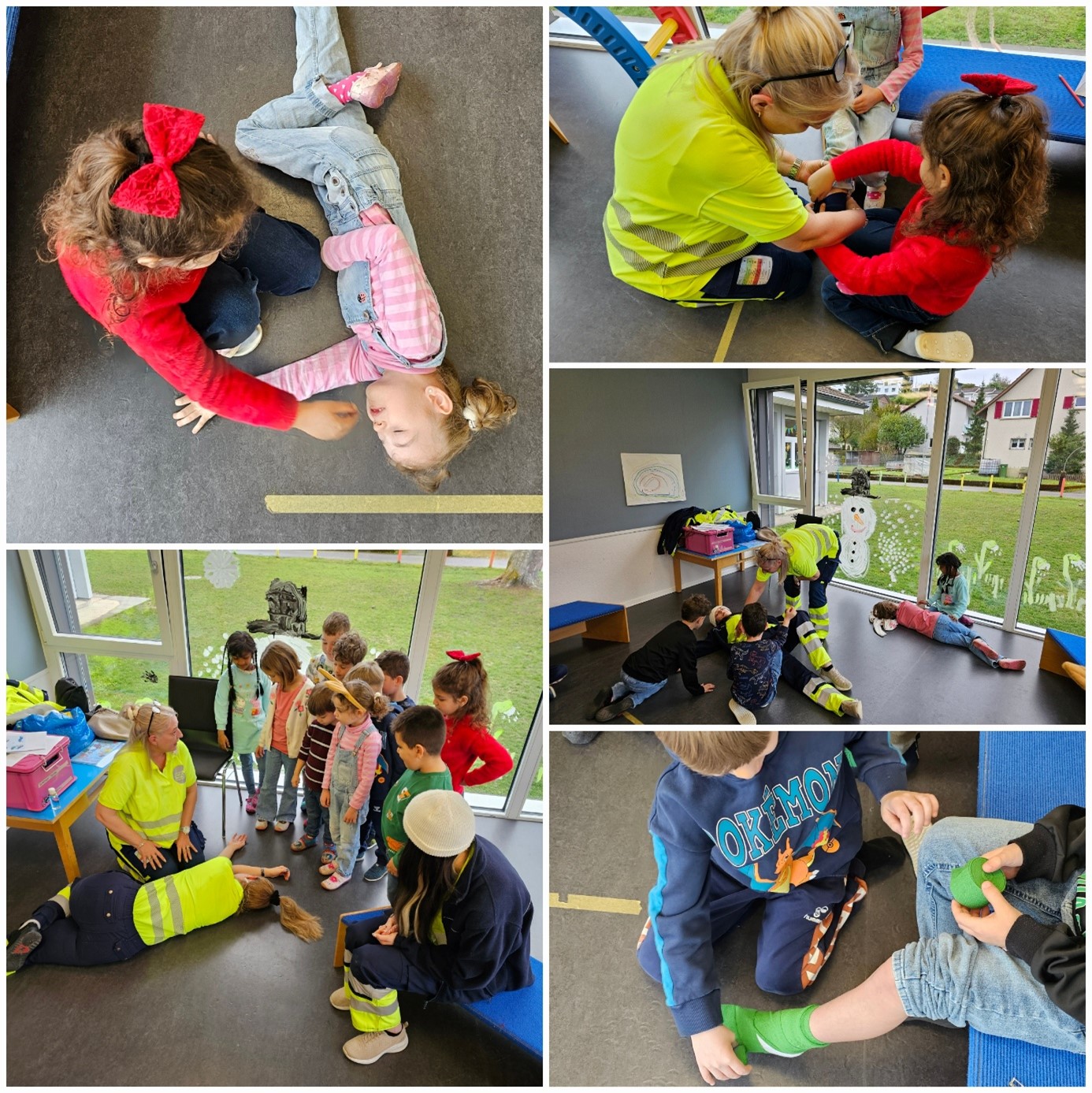 Aufmerksam und voller Neugier hörten die Kinder den Frauen des Samaritervereins Rothrist zu, als sie einen Input zur ersten Hilfe erhielten. Danach schlüpften die Kinder selbst in die Rolle der Verletzten und der Helfer und lernten so die Seitenlagerung sowie das Verbinden von Wunden praktisch umzusetzen. Die Kinder waren alle sehr fasziniert und machten alle einen grossartigen Job. Nun sind die Kinder gewappnet, falls jemand in Not ist….