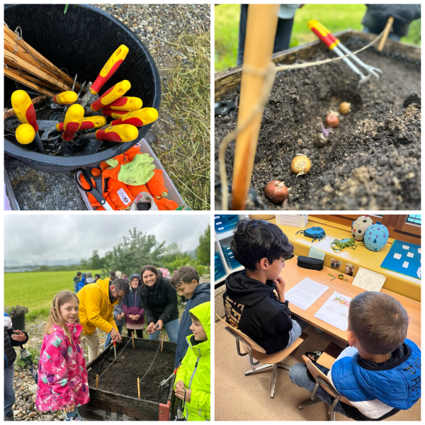 Die Klassen P2e und P4e haben sich gemeinsam um den Schulgarten im Rothmatt gekümmert und Kartoffeln angepflanzt. Trotz des Regens arbeiteten die zwei Klassen in kleinen Gruppen zusammen, um die Kartoffelsetzlinge in die Hochbeete einzusetzen. Die Aktion wurde eingeleitet durch die Geschichte von «Herr Döpfel», welche die Grossen den Kleinen vorlasen. In der nächsten Zeit haben die Kinder die gemeinsame Aufgabe, die bepflanzten Beete regelmässig zu giessen. Ende Sommer können die zwei Klassen dann ein Erntefest feiern. Anja Pfiel
